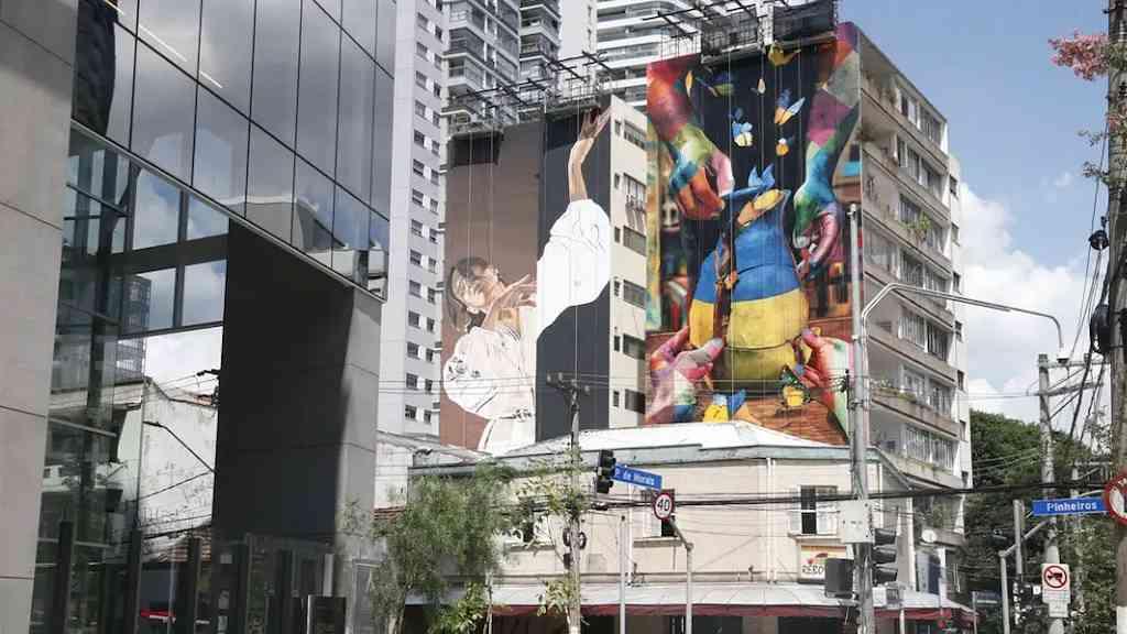 Cada uma dessas duas imagens que foram pintadas na parede de um mesmo prédio residencial localizado na Avenida Pedroso de Morais, número 144, expressa estilo e linguagens diferentes. Mas elas foram feitas por meio de um trabalho colaborativo e estão lado a lado para lembrar os dois anos da guerra entre a Ucrânia e a Rússia e defender proteção ambiental. Chamado de The Exchange (o intercâmbio, em português), o mural está sendo inaugurado hoje (5) e é uma iniciativa do Instituto Ucraniano no Brasil.