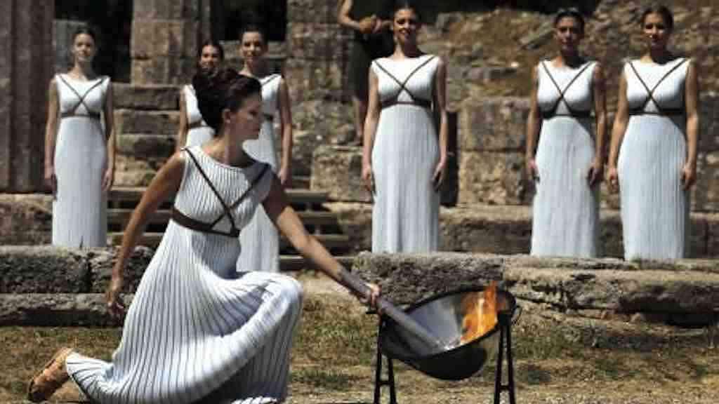 Centenas de pessoas observavam em silêncio perto das ruínas do templo dedicado à deusa Hera em Olímpia, no sul da Grécia, onde os gregos competiam nos Jogos da antiguidade. O ritual com a alta sacerdotisa e a tocha foi criado oito décadas atrás para os Jogos de Berlim.