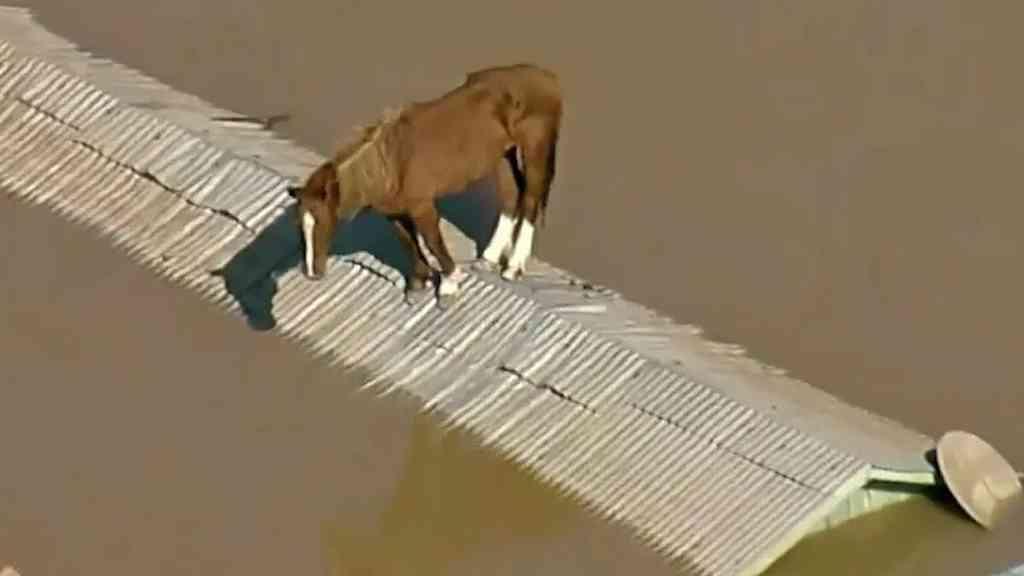 Equipes de resgate do Rio Grande do Sul estão mobilizadas para salvar um cavalo que ficou ilhado no telhado de uma casa em Canoas, na região metropolitana de Porto Alegre.