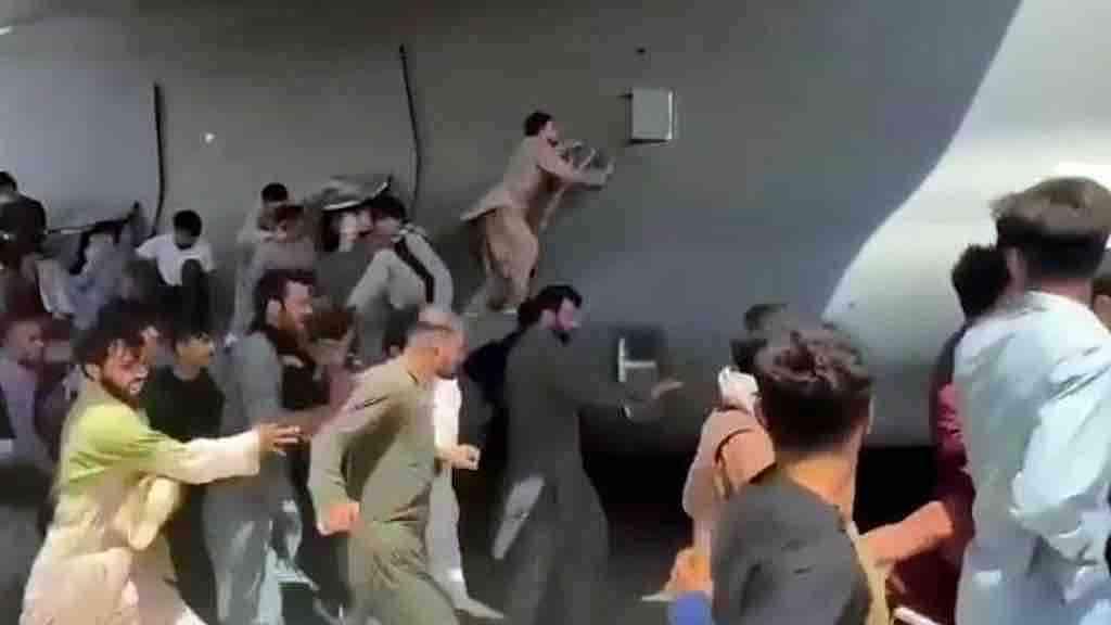 A Força Aérea dos EUA irá examinar todos os vídeos que circulam nas redes sociais do avião de transporte C-17, no momento em que centenas de pessoas perseguiram a aeronave, algumas tentando desesperadamente agarrar-se aos flancos ou às rodas. Outro vídeo mostrou a mesma aeronave em voo sobre Cabul e o que parecia ser duas pessoas caindo do avião, já em grande altitude.