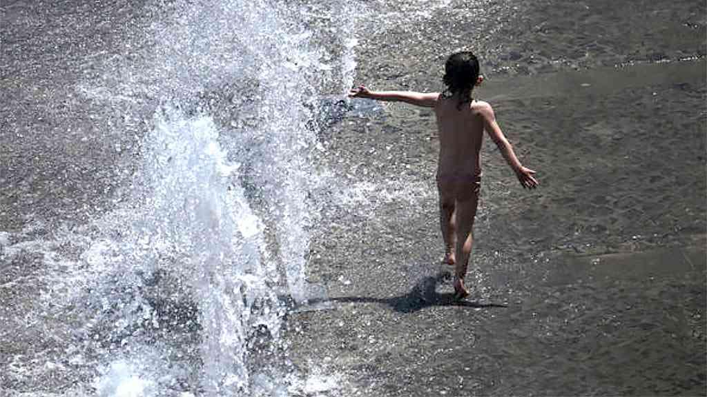 Criança brinca, em Roma, perto de hidrantes abertos devido ao calor que castiga a cidade
