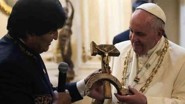 O presidente da Bolívia, Evo Morales, presenteou o Papa Francisco com um peculiar crucifixo em madeira com Cristo sobre uma foice e um martelo, símbolos do comunismo, durante uma reunião que os dois mantiveram na noite de quarta-feira em La Paz.