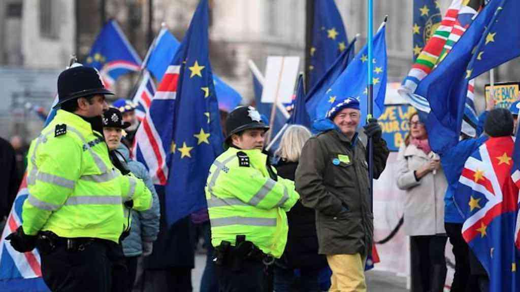 Ativistas favoráveis e contrários ao Brexit fazem manifestação perto do Parlamento, em Londres