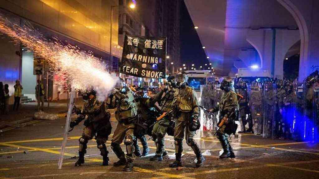 Soldados equipados com capacetes, escudos e cassetetes são vistos montando barricadas de arame farpado e lançando o que parece ser gás lacrimogêneo contra os manifestantes. Os militares exibem uma bandeira vermelha com a frase "Atenção: parem de atacar ou usaremos a força", as mesmas palavras usadas pela polícia de Hong Kong ao confrontar os manifestantes pró-democracia.
