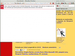 Por Celso Lungaretti, de São Paulo Não sou de ficar anunciando de 10 em 10 minutos os meus artigos no Facebook e no Twitter, como vejo muitos fazerem. Posto-os apenas uma vez, pois detesto esses artifícios típicos da propaganda, "quanto mais aparecerem, maior a chance de serem notados", etc. Mesmo assim, há internautas com índole totalitária tentando fazer com que não apareçam sequer uma vez. Ao anunciar meu artigo no domingo 26, fui impedido:  "essa mensagem possui conteúdo bloqueado: Sua mensagem não pode ser enviada pois ela tem conteúdo que outras pessoas no Facebook denunciaram como abusivo".