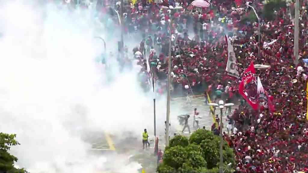 Uma bomba de efeito moral marcou o início do tumulto generalizado que encerrou a festa do Flamengo