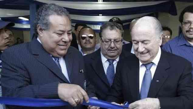 Ex-dirigente da Fifa Julio Rocha (esquerda) e Joseph Blatter, presidente da Fifa, durante inauguração de estádio em Managua, no Nicarágua