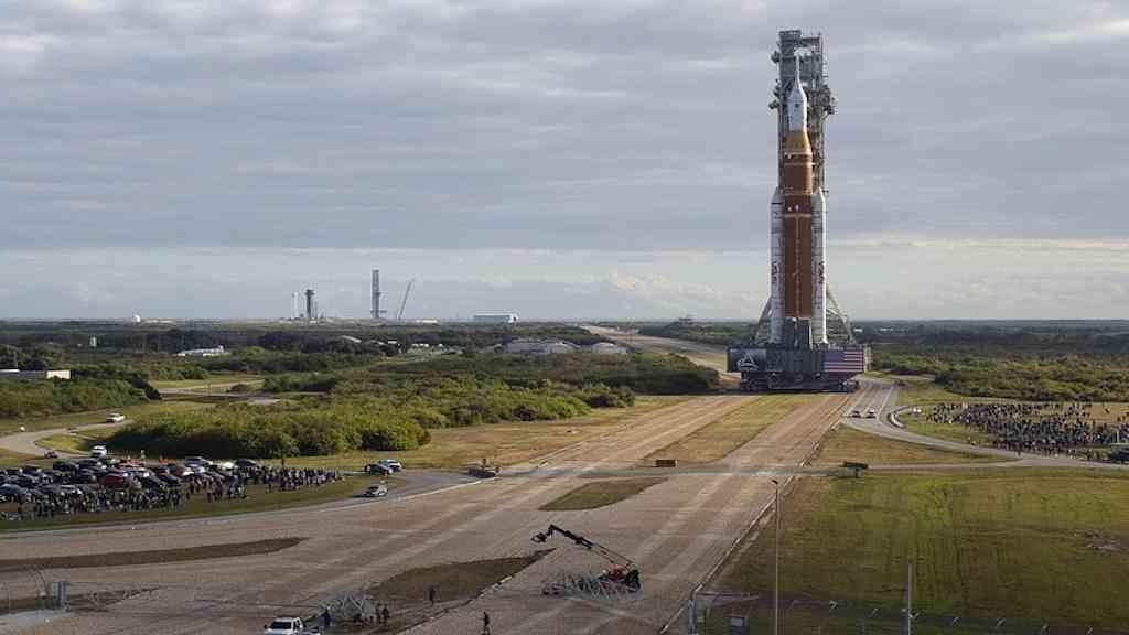 O foguete SLS, acoplado à nave Orion, foi transportado verticalmente pelos 6,4 quilômetros que separam o edifício de montagem e a rampa de lançamento 39B, em uma operação que demandou quase 12 horas.