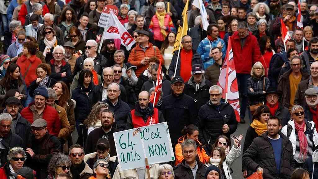 Uma ampla aliança de sindicatos convocou os trabalhadores a se juntarem ao oitavo dia de manifestações nacionais desde meados de janeiro contra a política impopular. Os protestos atraíram milhões de pessoas e as paralisações afetaram os setores de transporte e energia e deixaram lixo se acumulando nas ruas de Paris.