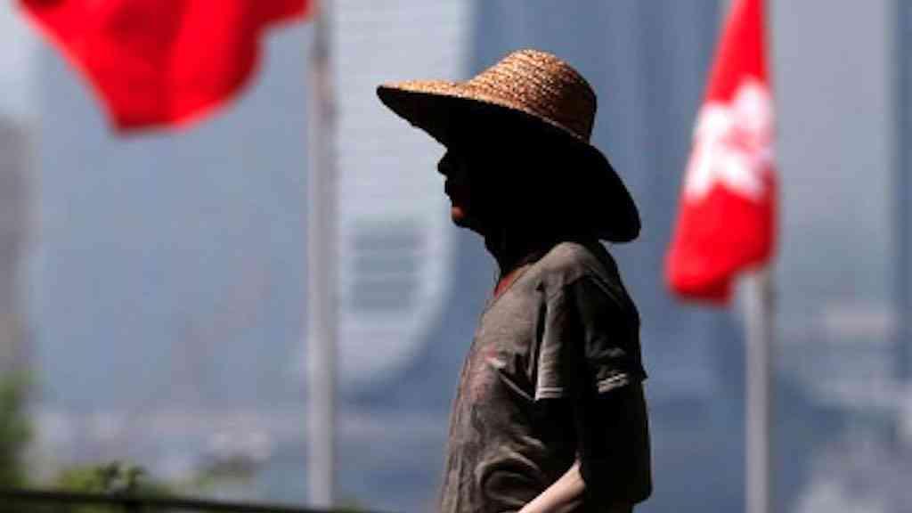 Jardineiro rega plantas com bandeiras da China e de Hong Kong ao fundo