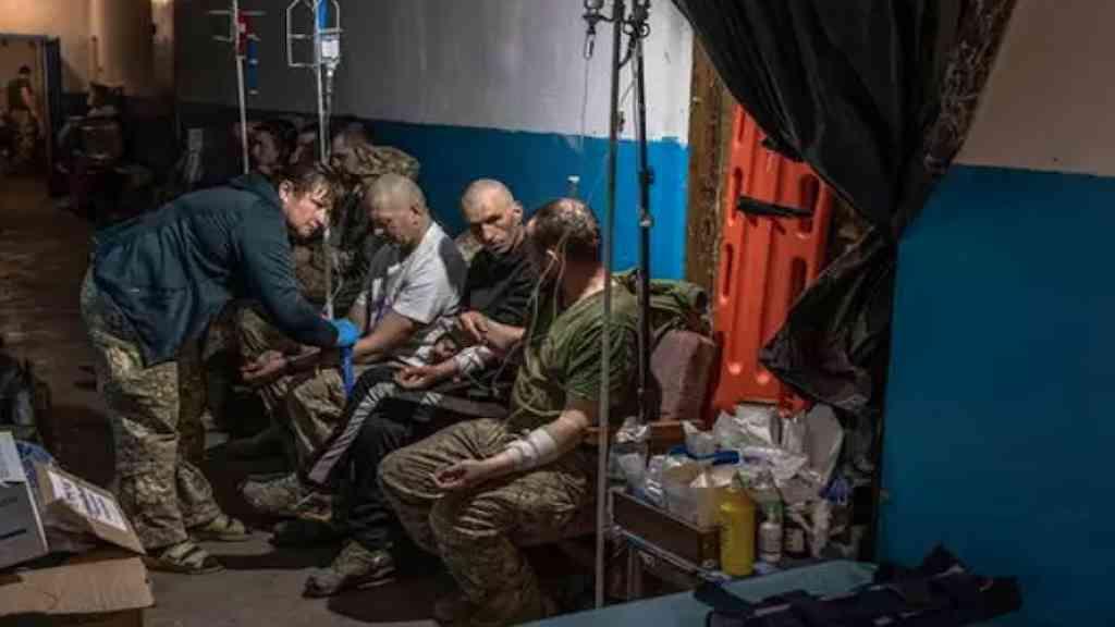Soldados ucranianos em hospital de campanha na região de Lugansk, no leste da Ucrânia