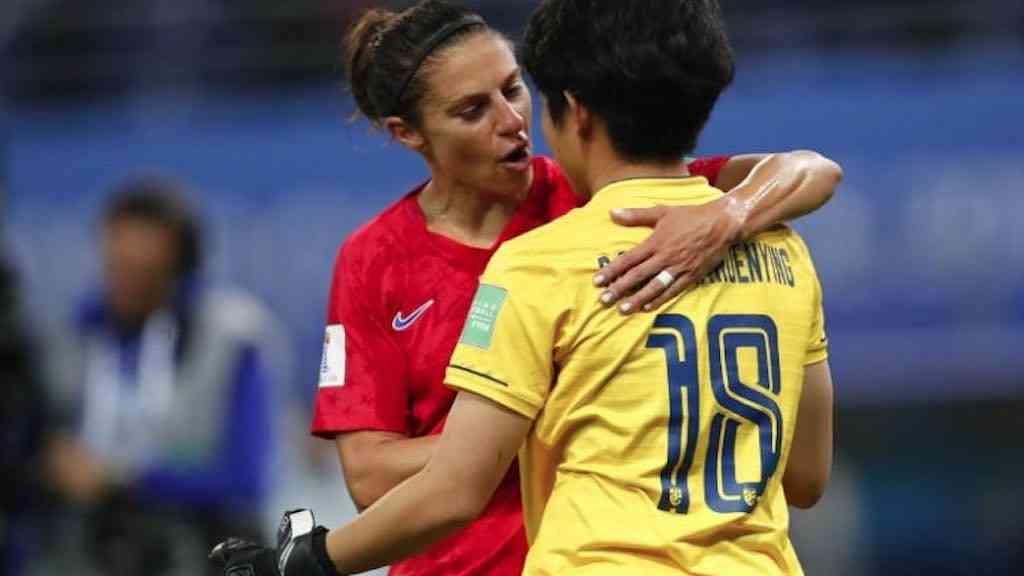 Goleira da Tailândia, Sukanya Charoenying, e atacante dos EUA, Carli Lloyd