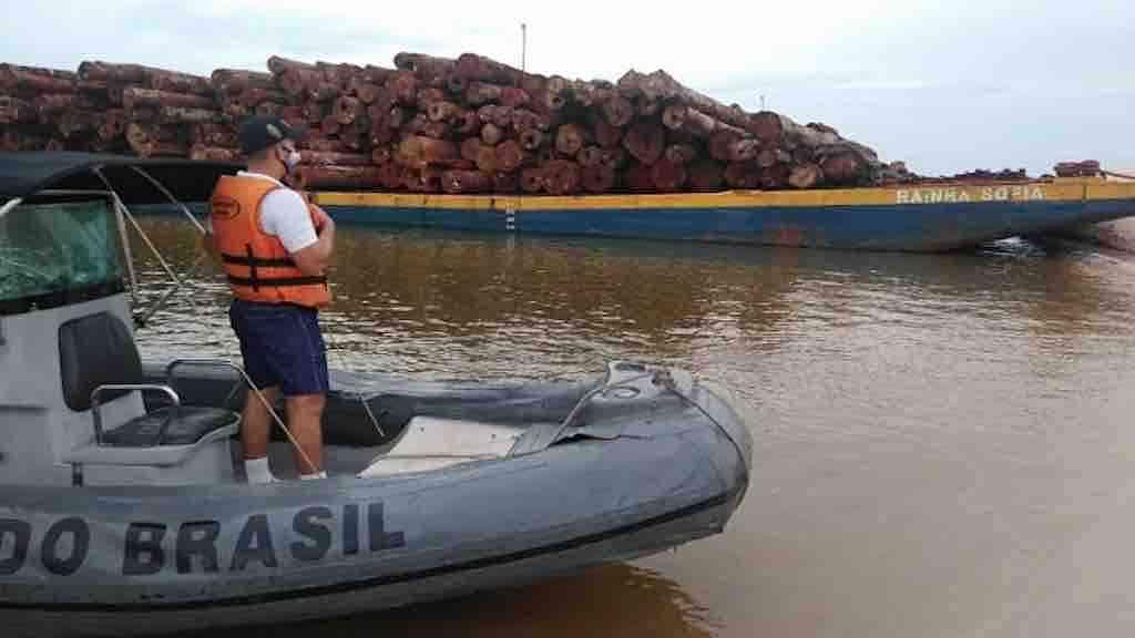 Carregamento de madeira extraída da Amazônia transportado em quatro embarcações sendo apreendido pela Operação Verde Brasil 2, das Forças Armadas brasileiras, no estado do Pará