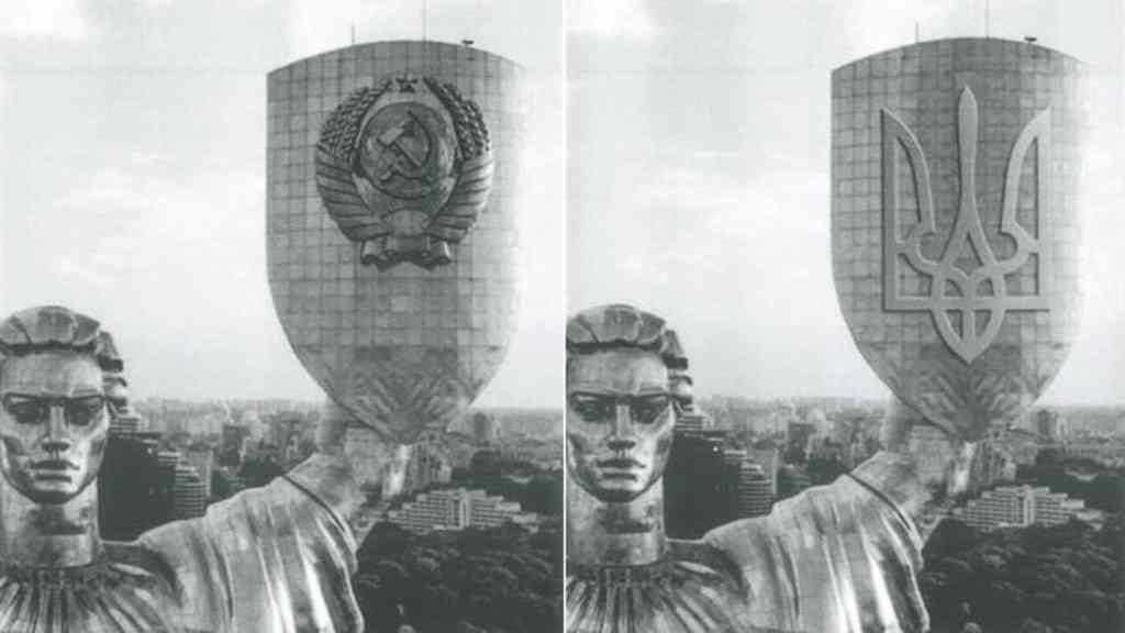 O governo da Ucrânia iniciou neste domingo a substituição da foice e do martelo no Monumento à Pátria, em Kiev, por um brasão ucraniano.