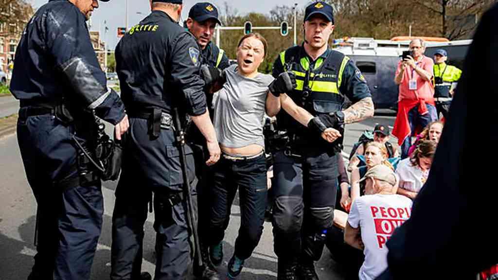 A ativista ambiental sueca Greta Thunberg foi detida pela polícia holandesa, neste sábado, durante um protesto do grupo Extinction Rebellion (Rebelião dos extintos) contra subsídios aos combustíveis fósseis.