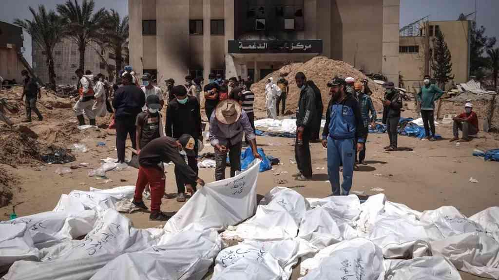 De acordo com as autoridades do enclave palestino, aos menos 49 corpos foram recuperados até o momento. “As equipes médicas localizaram uma terceira vala comum dentro do Complexo Médico Al-Shifa.