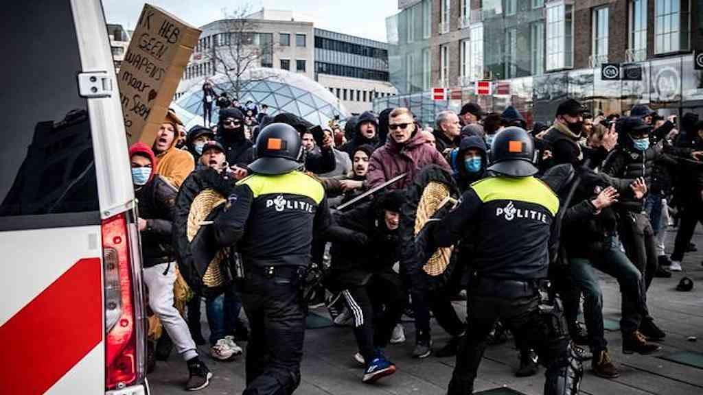 A polícia da Holanda entrou em confronto com manifestantes em pelo menos 10 cidades do país no domingo, pouco antes do início de um toque de recolher às 21h, imposto para conter o avanço da covid-19. Mais de 200 manifestantes foram detidos pelos policiais em todo o país.