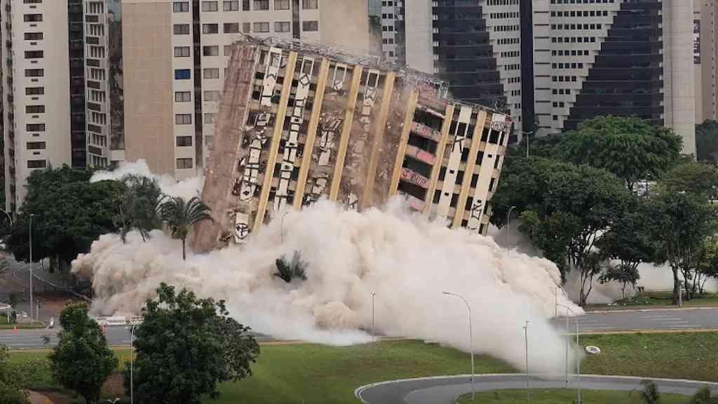 O antigo edifício Torre Palace Hotel, localizado no centro de Brasília, foi implodido às 10h01 deste domingo. Os explosivos foram colocados nos andares mais baixos do prédio, que ruiu em poucos segundos. A grande nuvem de poeira branca que subiu logo após a operação se dissipou quase por completo cerca de cinco minutos após a demolição.