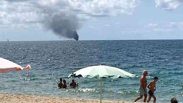 A fumaça do incêndio no barco de imigrantes pode ser vista da praia, em Crotone, na Cicília