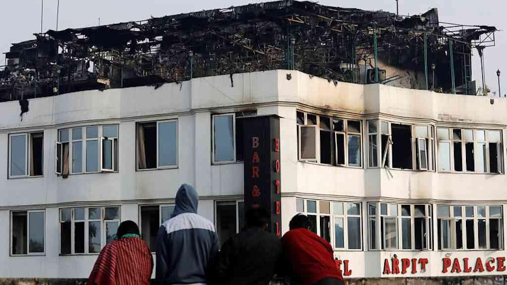 Entre os mortos estão uma mulher e uma criança que tentaram escapar pulando de uma janela no quinto andar do hotel no distrito de Karol Bagh. Parte do hotel estava reservado para uma festa de casamento.