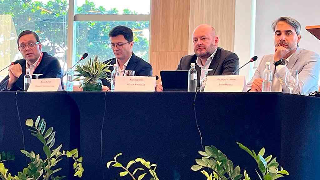 Os executivos Abel Castro, da Accor; Andres Fajardo (GHL); Bojan Kumer (Marriott International); e Ricardo Manarini (VWH Hotels), em entrevista coletiva nesta manhã, concordaram que o cenário para a região é menos tenso do que para os europeus e asiáticos.