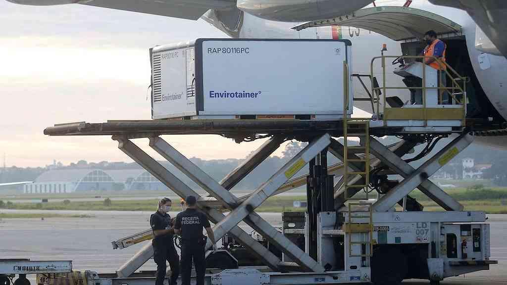 Chegaram na manhã desta quinta-feira os insumos para que o Instituto Butantan fabrique mais 14 milhões de doses da vacina contra o coronavírus CoronaVac. A carga, vinda da China, desembarcou no Aeroporto Internacional de Guarulhos.