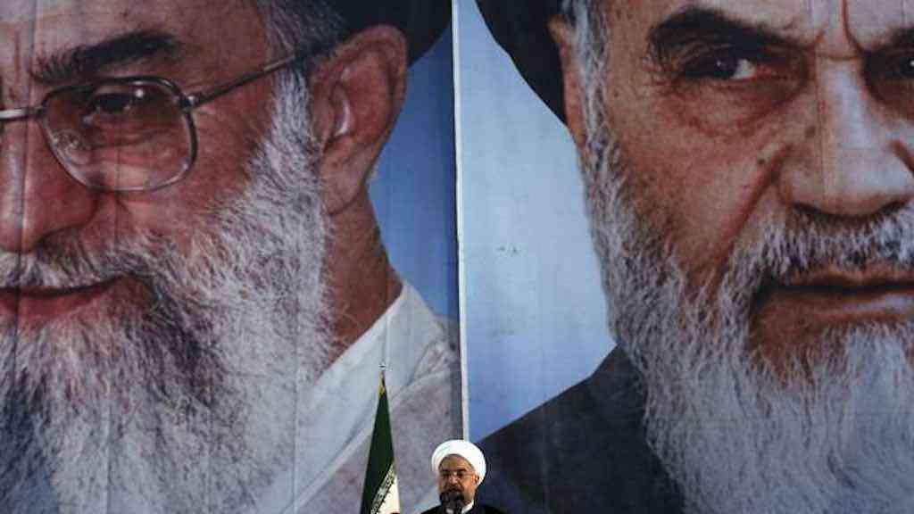 Presidente iraniano Hassan Rohani discursa em frente a retratos enormes dos aiatolás Khamenei (esq.) e Khomeini