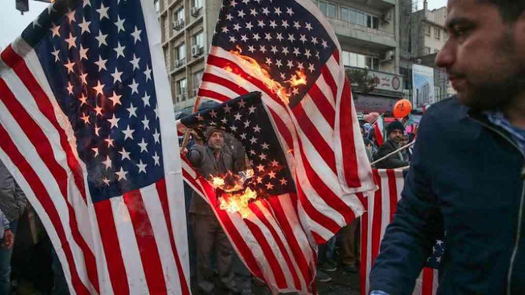 Iranianos queimam bandeiras dos EUA durante protesto para marcar 40 anos da Revolução Islâmica, em Teerã