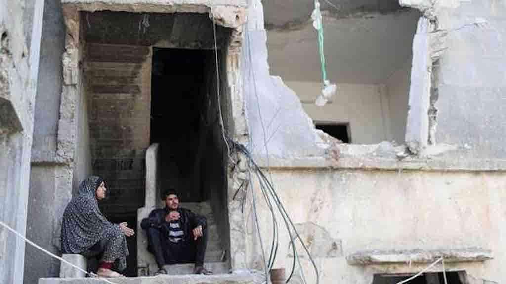 Palestinos em escombros de casa destruída por ataque aéreo israelense em Gaza