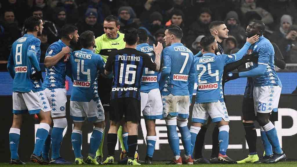 As tensões continuaram dentro de San Siro, com os torcedores da Inter insultando os jogadores do Napoli e imitando macacos para o zagueiro senegalês Kalidou Koulibaly, que acabou expulso.