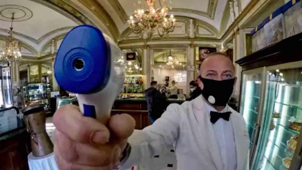 Garçom na porta de bar tradicional em Nápoles, sul da Itália