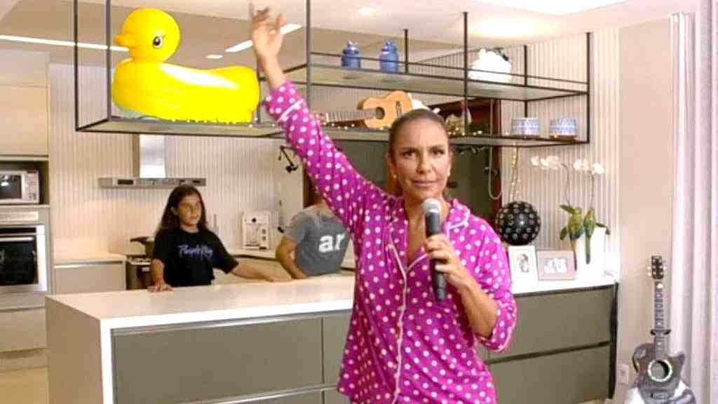 Aos 47 anos, Ivete ganhou os elogios dos internautas, nas redes sociais, durante as duas horas e meia em que a cantora mostrou toda sua naturalidade. Descalça e com rabo de cavalo, não se acanhou nem na hora de dar uma ajeitada na calcinha. O marido, Daniel Cady, e o filho mais velho do casal, Marcelo, 10, acompanharam tudo, com direito a danças e até uma bronca para não varrerem o chão.