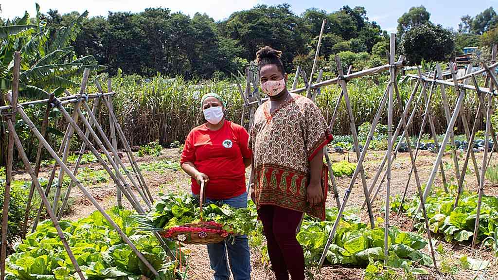 Suely e Kelvin colhem vegetais para o almoço coletivo das 450 famílias do Acampamento Marielle Vive, em Valinhos (SP); decisão da Justiça autorizou o despejo dos agricultores