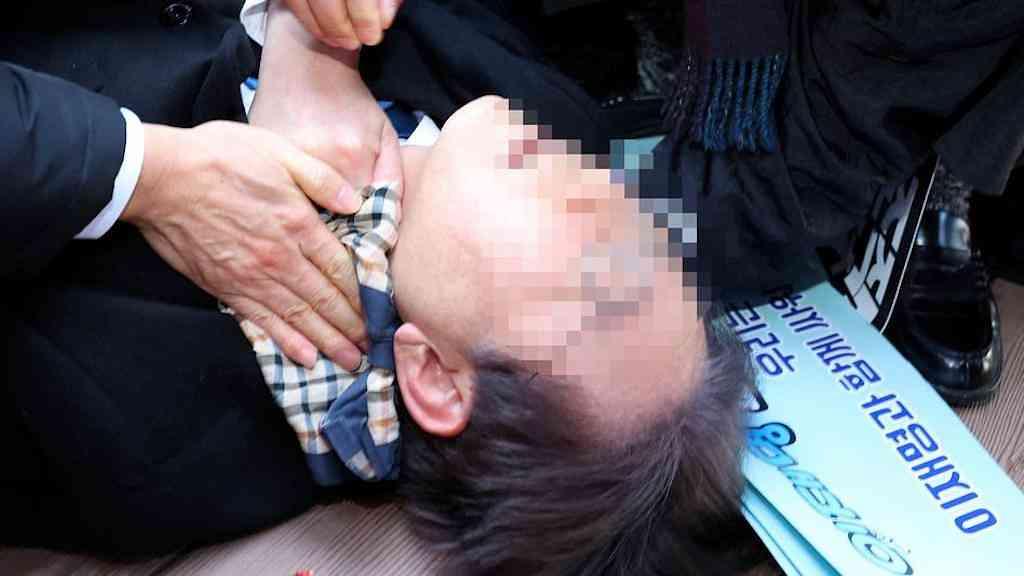 Nas imagens da TV, Lee é visto caindo no chão enquanto as pessoas o socorrem. A facada atingiu o lado esquerdo do pescoço, comunicou a polícia de Busan.