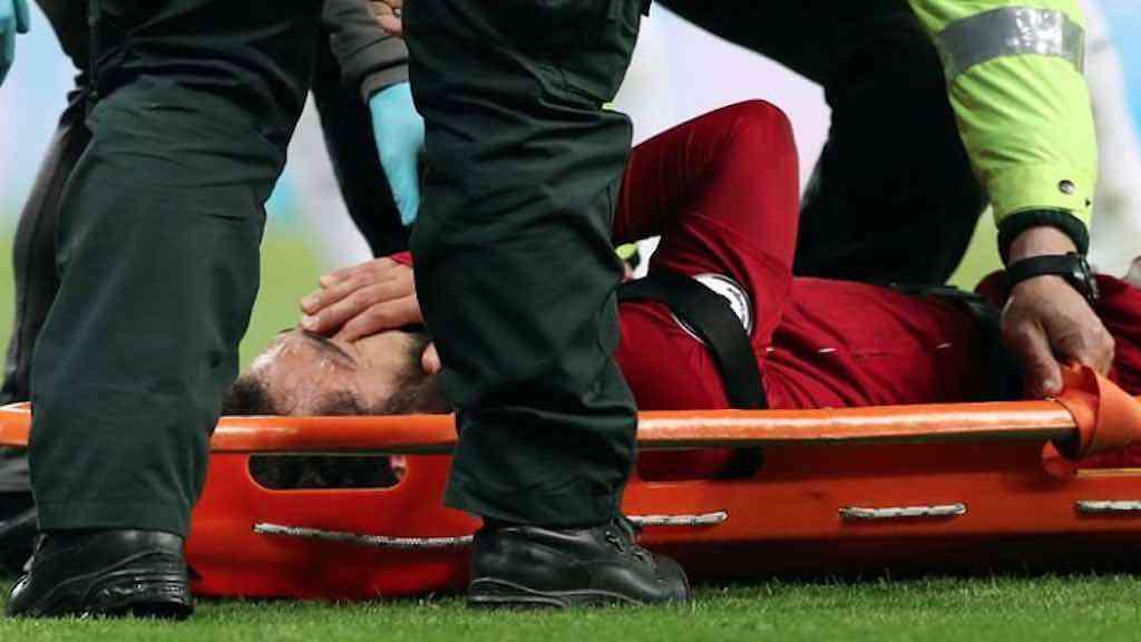 Mohamed Salah retirado de campo de maca após sofrer lesão na cabeça em jogo do Liverpoll