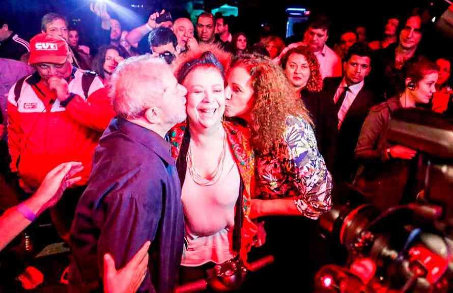 Lula e Jandira beijam a sambista Beth Carvalho, durante ato no Centro do Rio