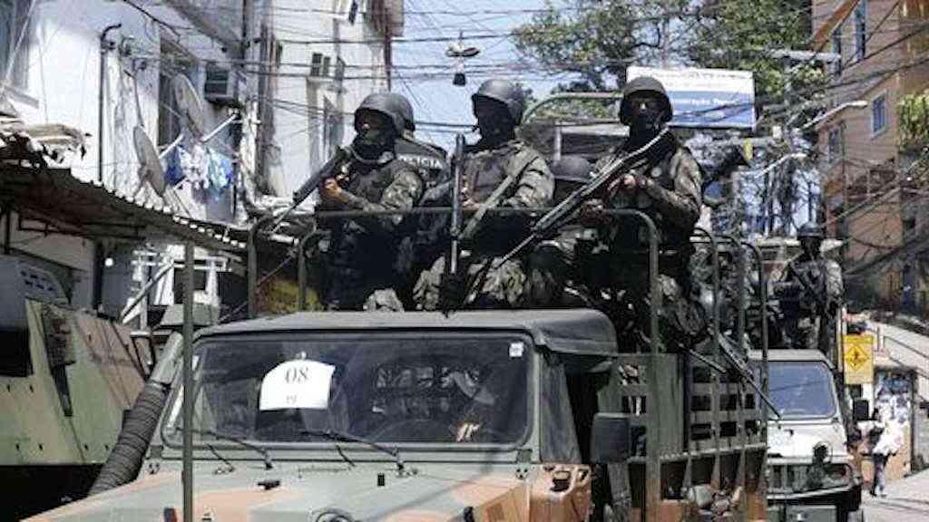 Segundo as Forças Armadas, apoiam a operação 24 veículos blindados e 16 embarcações leves da Marinha, que atuam em águas da Baía de Guanabara