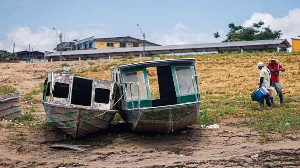 Com a seca extrema, embarcações ficam atoladas na margem do rio Solimões, em frente ao porto de Tabatinga (AM)