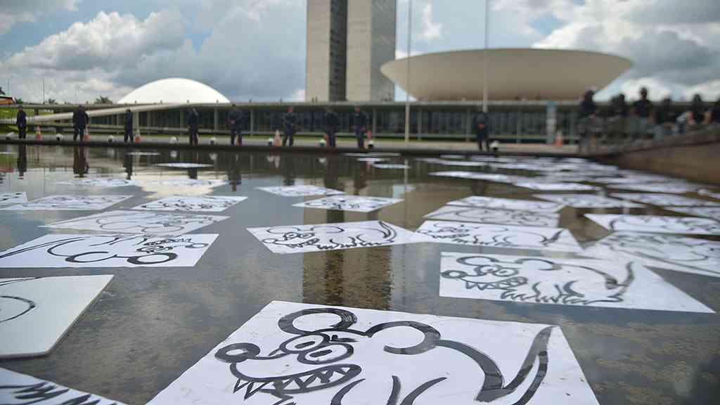 Ao contrário da semana passada, quando a PM espancou estudantes e atirou bombas de efeito moral e gás de pimenta sobre o público que protestava contra a PEC 55, conhecida como ‘PEC da Morte’, neste domingo as manifestações foram permitidas próximo ao espelho d'água do Congresso. Sob o olhar complacente dos policiais presentes, espalharam desenhos de ratos, simbolizando, segundo eles, os políticos.