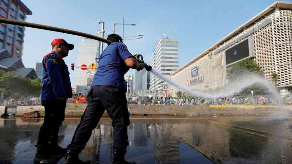 Bombeiros limpam rua após noite de protestos em Jacarta