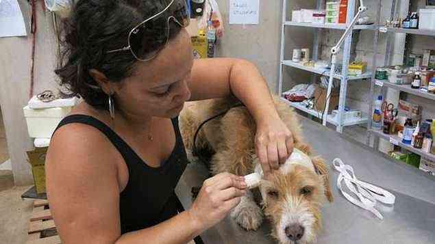 Voluntária troca os curativos de um cão: o tratamento é lento, mas eficiente