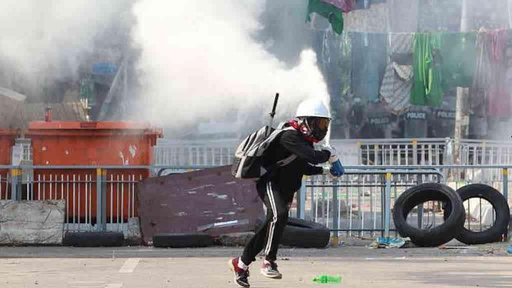 Manifestante usa extintor de incêndio ao fugir da polícia durante protesto em Yangon, em Myanmar