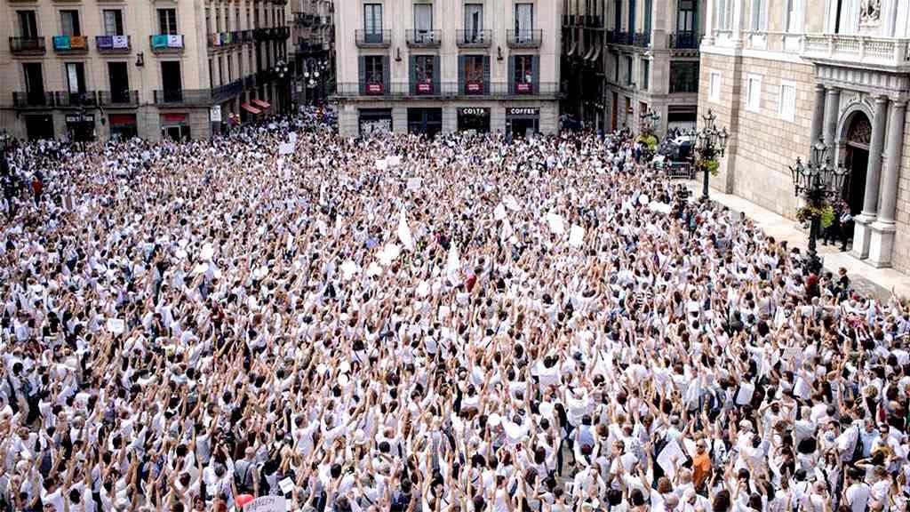 Em Barcelona, os manifestantes cantaram "vamos conversar" em catalão; enquanto muitos levaram placares e faixas criticando líderes políticos por não encontrarem uma solução diplomática para o impasse. Na praça de Sant Jaume, em Barcelona, milhares de pessoas se reuniram. Reclamavam por diálogo entre a região catalã e o governo espanhol; perante a possível declaração de independência