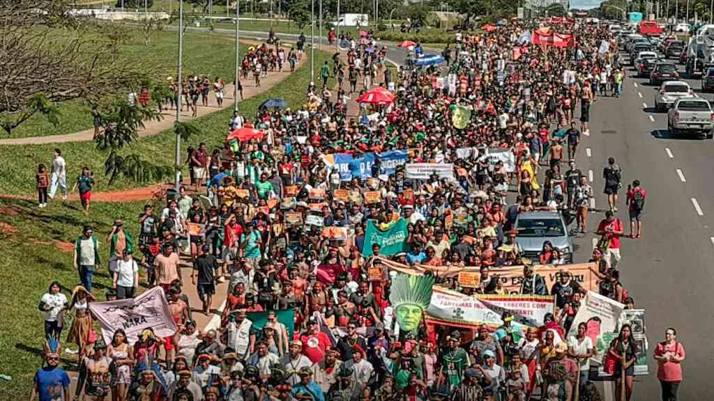 Sob sol forte, o grupo percorreu os 6 quilômetros até o Congresso Nacional, principal alvo das críticas do movimento, que acusa a maioria dos deputados federais e senadores de propor e aprovar leis contrárias aos direitos constitucionais dos povos originários, colocando em risco seus territórios e modos de vida.