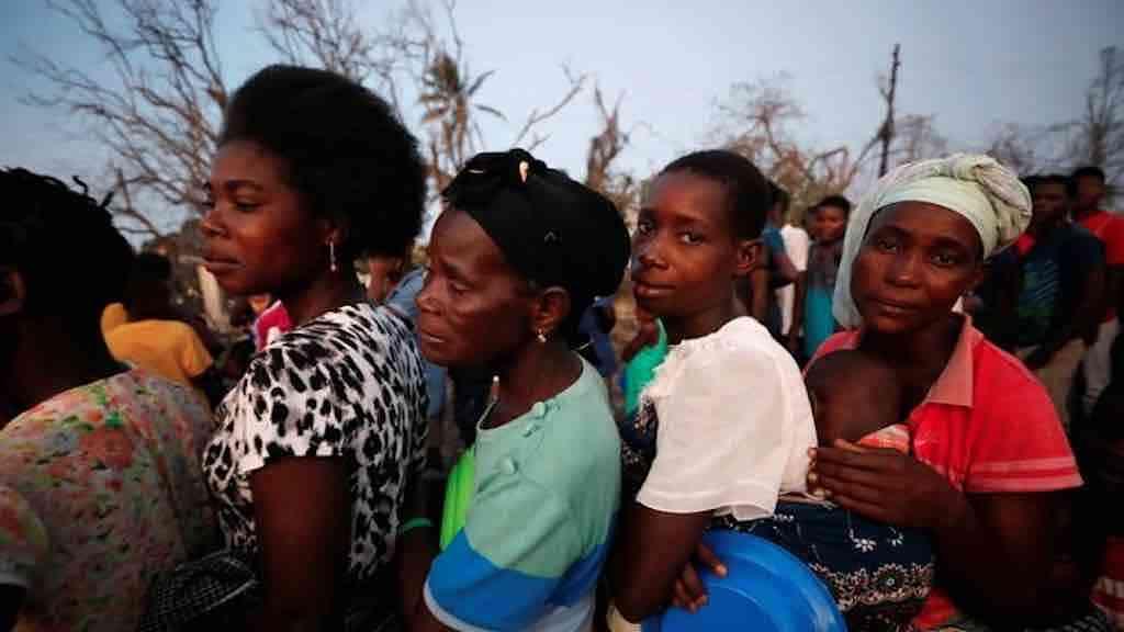 Mulheres fazem fila para receber comida em acampamento para desabrigados pelo ciclone Idai