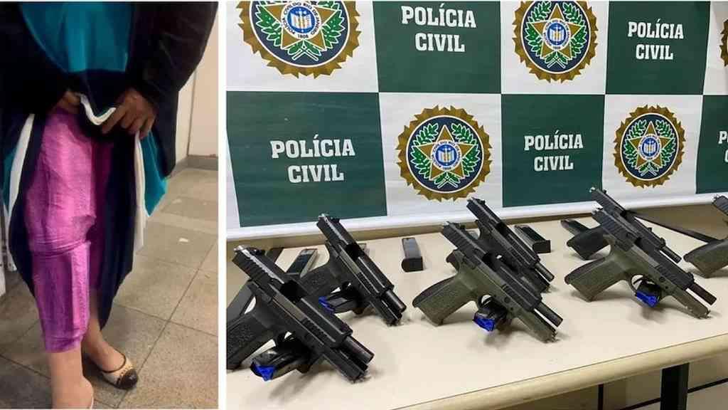Uma mulher foi presa em flagrante, na madrugada de terça-feira, na Rodoviária de Niterói, região metropolitana do Rio, transportando sete pistolas automáticas presas ao corpo, além de carregadores e kits rajada que aumentam o poder de fogo das armas.