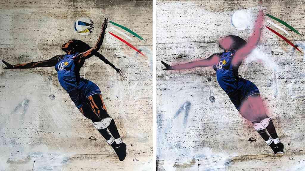 A arte de rua dedicada à medalhista olímpica Paola Egonu, que conquistou o ouro com a seleção italiana de vôlei feminino nos Jogos de Paris, foi vandalizada nesta terça-feira, apenas um dia depois de ter sido pintada em um mural em Roma.