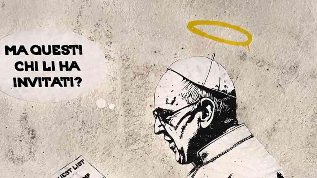 “Mas quem convidou essas pessoas?”, questiona Francisco no mural de Laika, que surgiu em uma parede na rua Nicolò Piccolomini, a cerca de dois quilômetros do Vaticano.