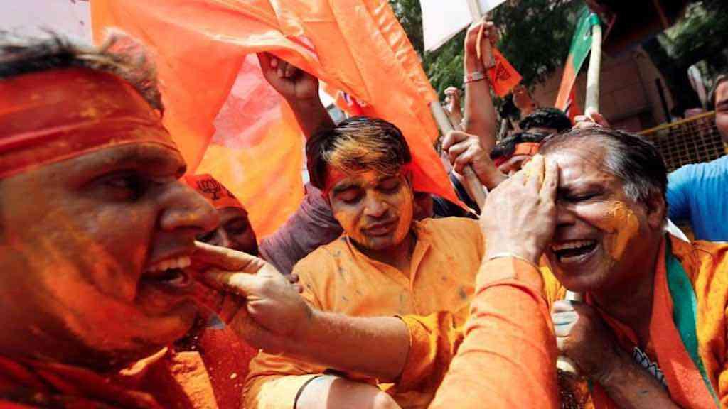 Apoiadores de partido BJP comemoram resultado de eleição na Índia
