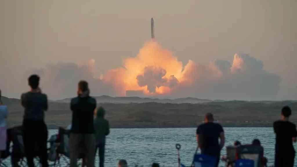 A espaçonave de dois estágios, que consiste na Starship montada no topo de seu imponente foguete Super Heavy, decolou da base de lançamento Starbase, próximo à Boca Chica Village, no sul da Costa do Golfo do Texas.